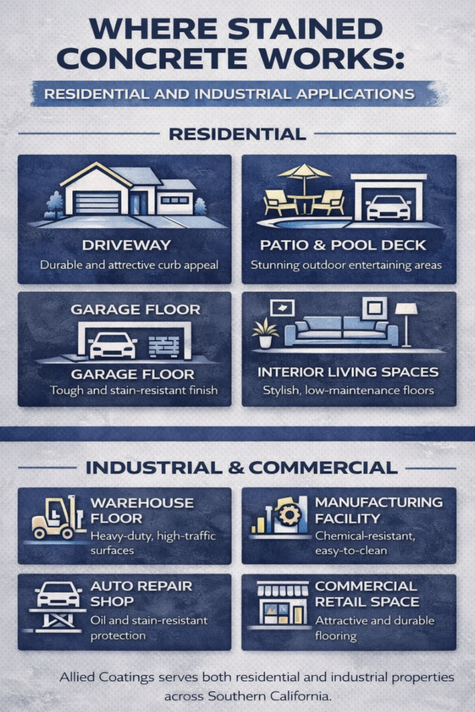 Allied Coatings has been delivering concrete staining to residential and commercial properties across Southern California for over 25 years, bringing the same technical standards and premium materials to a Wilmington garage floor as they bring to a large-scale industrial facility.